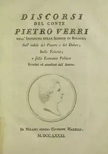Pietro Verri (12 de diciembre de 1728 - 28 de junio de 1797). Escritor y periodista ilustrado italiano. Se encargó de la reforma de la administración italiana durante el gobierno imperial de María Teresa de Habsburgo. Participó en 1761 en la Sociedad de los Puños, en la cual se leían y comentaban las publicaciones más avanzadas llegadas de Francia e Inglaterra. Junto con su hermano Alessandro trabajó como periodista en el diario "El Café", periódico que entre 1764 y 1766 proponía a sus lectores vivas polémicas sobre la renovación civil y cultural.
