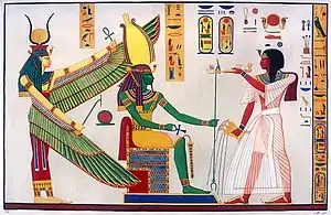 El color verde (wʒḏ)[5] era para los antiguos egipcios, símbolo de frescura y vida. Los dioses de la tierra y de la fertilidad, Geb y Osiris se solían representar con la piel de color verde; además, este color era también un potente signo de resurrección.[3]