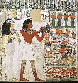 El negro de carbono se utilizó abundantemente en la decoración de los bajorrelieves de las tumbas, como la de Menna (TT69) en la necrópolis tebana.[15] El negro de carbono también se utilizó para la decoración de cerámica predinástica[16] y fue la materia prima básica para la fabricación de tinta para los escribas.[17]