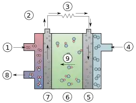 Esta pila produce la energía a través de una reacción redox entre el hidrógeno y el oxígeno. En el ánodo, el hidrógeno es oxidado según la reacción: