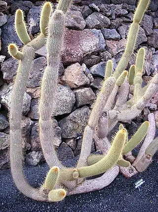 Es un cactus arbolado que alcanza relativamente rápido hasta 5 m de altura los tallos tienen 7,5 cm de diámetro con 9 a 12 costillas y areolas de separación de 1 cm con 12 a 15 espinas de color amarillento que van oscureciendo con la edad, tienen hasta 4 cm de largo Las flores son nocturnas en forma de embudo de color rosa, vienen en una zona peluda en un lado del tallo superior. Miden 7.5 cm de largo y 5 cm de diámetro (5 cm). Su ovario está cubierto de pelo. La fruta es morada con las semillas negras y son comestibles. Presenta de 15 a 25 espinas, entre radiales y centrales, ya que son indiferenciables unas de otras, amarillo-rojizas, al tiempo rojizas, después negras en la base y al ápice grisáceas, rectas o ligeramente curvas, aciculares, algunas adpresas y otras pronunciadas hacia afuera. Planta arborescente de 3 a 6 m de altura. Ramificaciones rectas o ligeramente curvas, próximas entre sí, ápice con lana, redondeado. Tallo principal corto y poco leñoso. Costillas de lO a 14, pronunciadas y distantes entre sí. Ramas adultas desarrollan margen deltoide por podarios. Areolas ovadas, las apicales con lana. Zona fértil diferenciada por lana a lo largo de ramas adultas. Flores con tépalos oblongos a lanceolados y rosas. Estambres blancos y estigma lobulado.