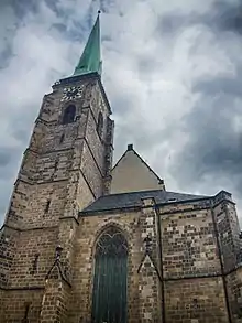 - La catedral de San Bartolomé es sin duda el monumento más notable de la ciudad. Su construcción comenzó poco después de la fundación de la ciudad, en el siglo xiii. Su torre mide 102,6 metros y es la más alta en todo el país; desde su galería, abierta al público, se ve toda la ciudad. Dentro de la catedral se encuentra la Virgen de Pilsen (Plzeňská madona), la famosa estatua gótica de 1390. En 1993, el papa Juan Pablo II estableció el Obispado de Pilsen, y entonces la iglesia llegó a ser catedral.