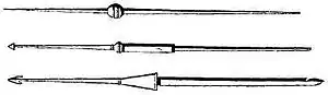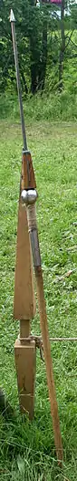 La punta era pequeña y de forma piramidal. Al impactar perforaba con facilidad un escudo de madera; al ser la vara metálica más delgada que la punta se deslizaba por el agujero hecho por la punta con facilidad, alcanzando a menudo a quien se protegía tras el escudo. Esto lo hacía similar a la jabalina española, la soliferrum, fabricada totalmente de metal.