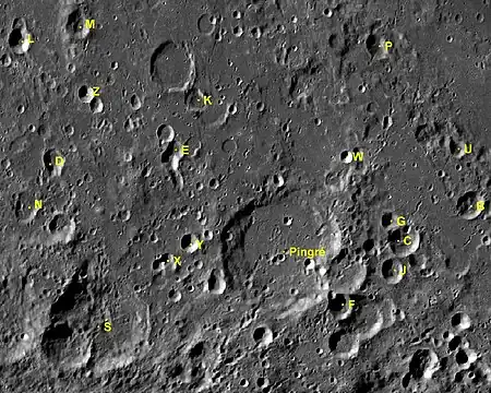 Por convención estos elementos son identificados en los mapas lunares poniendo la letra en el lado del punto medio del cráter que está más cercano a Pingré.