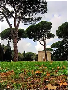 Representa unos pinos ubicados cerca de una catacumba, es decir, una caverna que se suele utilizar para enterrar a los muertos. La atmósfera se torna de repente sombría en esta sección, contrastando por completo con la anterior. Se abre con una austera frase de canto llano de carácter solemne y meditativo, que se escucha en dinámica piano en las cuerdas apagadas y divididas. Esta melodía se intercala con un lúgubre cantabile de las trompas con sordinas y el grave tañido de una campana, como para recordarnos la memoria de los antiguos mártires. Una trompeta solitaria, en contrapunto con los violines, ilumina el ambiente con un himno mariano. Desde las profundidades se eleva una salmodia encomendada a clarinetes, trompas y violonchelos que se transforma gradualmente con la entrada de los demás instrumentos en un crescendo majestuoso y austero.[12] Es un clímax construido en torno a una insistente figura repetida en quintas en las cuerdas.[4] Tras el rápido desvanecimiento de la salmodia, una coda nos devuelve a la sombría atmósfera inicial.[12] El himno que se escucha es concretamente el Kyrie ad libitum 1, Clemens Rector; y el Sanctus de la Misa IX, Cum jubilo. El sonido se eleva y se hunde de nuevo en la catacumba. Una trompeta fuera de escena toca el himno del Sanctus. Los instrumentos graves de la orquesta y el pedal del órgano, con registros de 16’ y 32’,[13] representan la naturaleza subterránea de las catacumbas, mientras que los trombones y las trompas representan el canto de los sacerdotes.[4]
