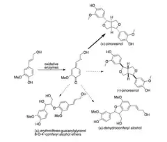 - Davin, Laurence B.; Bedgar, Diana L.; Katayama, Takeshi; Lewis, Norman G. (1992). «On the stereoselective synthesis of (+)-pinoresinol in Forsythia suspensa from its achiral precursor, coniferyl alcohol». Phytochemistry 31 (11): 3869-74. PMID 11536515. doi:10.1016/S0031-9422(00)97544-7.