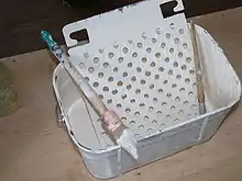 - Cubeta y bandeja: sirven para traspasar pintura al rodillo. La bandeja es una superficie con orificios que se utiliza para escurrir el rodillo y eliminar la pintura sobrante