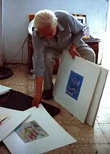 Enrique Tábara, artista ecuatoriano, mostrando unos de sus bocetos