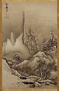 Los artistas más destacados del período Muromachi fueron los pintores-sacerdotes Shubun y Sesshu. Shubun fue un monje del templo Shōkoku-ji en Kioto, y el pintor del paisaje realista titulado Leyendo en un bosque de bambú, en el cual se vislumbra un profundo retroceso de la perspectiva espacial.[24] Sesshu, al contrario del resto de artistas del mismo período, tuvo la oportunidad de viajar a China y estudiar las técnicas y conceptos de la pintura directamente desde su fuente de origen. Una de las obras más importantes de Sesshu es el Rollo del extenso paisaje, en el cual se representa un paisaje continuo de las cuatro estaciones.[25][26]
