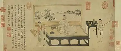 Un muy célebre retrato[21] (datado a finales de la época de los Song de Norte, primer cuarto del siglo XII; esta datación está discutida actualmente: Song del Sur,?[22][23] ) representa a un letrado, pincel en mano y con la mirada perdida en una profunda meditación. Un servidor se apresta a servirle té (o alcohol). Está representado a la izquierda en tres cuartos, sentado ante una pantalla pintada que representa parejas de patos en la ribera de un río. A esta pantalla está enganchado un rollo vertical que representa al mismo hombre representado también en tres cuartos, pero a la derecha. Este tipo de retrato "en abyme", realizado por un pintor profesional, es emblemático de la cultivada sofisticación que distingue el letrado de los pintores profesionales.