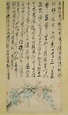 A este grupo se añade, en el siglo X , el pintor letrado o erudito que se impuso progresivamente como la figura esencial del mundo del arte.[16] Pintor aficionado en sus horas libres, se distinguía por su dominio, corporal y mental, de la calligraphie, de la tinta negra, del agua (sus modulaciones en la tinta) y del pincel (con todos los ángulos de ataque del apoyo, todos los efectos de puntuaciones posibles) que debía, como para la poesía caligrafiada, reflejar la personalidad del pintor[17] y en donde el color era, en principio, accesorio y hoy muy poco visible a menudo. Estos amateurs reivindicaban su independencia y la gratuidad de su práctica artística. Sin embargo, parece que estos bellos principios escondían sutiles prácticas sociales en las que los regalos, los intercambios, formaban parte de un conjunto de vínculos que aseguraban la solidaridad de las redes de contactos y permitía acceder a ciertos favores. Finalmente, a partir de la época Yuan, numeroso eruditos se vieron obligados a vivir del comercio de su pintura. Se hicieron especialistas en pintura de flores y de pájaros, de insectos y otros animales, uno de los géneros practicados por los pintores de la Academia, aun conservando el espíritu de la pintura de erudito.