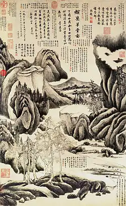 Por lo demás, es significativo que las escasas hojas de estudio (fenben) que subsisten pertenezcan únicamente a pinturas de profesionales o de pintores anteriores a la distinción entre profesionales y pintores letrados.[26] Esta práctica parece efectivamente poco compatible con el ideal de espontaneidad de los letrados. Sin embargo, la rareza de estas hojas permite pensar que, salvo excepciones, fueron destruidas de manera sistemática y que su ausencia no permite pues excluir su uso, en particular para composiciones de gran tamaño.