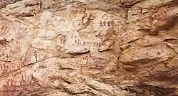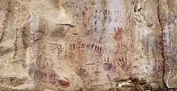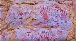 Este sitio arqueológico concentra una gran cantidad de figuras de personas, animales, herramientas, símbolos, manos y representaciones de experiencias vividas por los antiguos nómadas como cazando animales, que dejaban como mensaje o recuerdo para otras personas o generaciones, distribuidas en una pared de roca. Junto a las improntas de las manos existen algunos personajes esquematizados, plasmados en color rojo claro, a diferencia de las manos representadas en color rojo o marrón oscuro.[1]