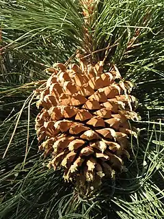 ![]() Cono de semillas de un pino de Coulter en el monte Wilson (California). | ||