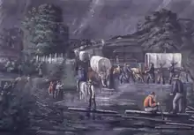 El primer tramo del viaje, desde Winter Quarters hasta el Fuerte Laramie llevó a la compañía seis semanas, arribando al fuerte el 1.º de junio. La compañía se detuvo para hacer reparaciones y cambiar las herraduras a los caballos. En el Fuerte Laramie, se unieron al grupo de vanguardia miembros del Batallón Mormón,[32] y a quienes se les había dado de baja por enfermedad fueron enviados a pasar el invierno a Pueblo (Colorado). También en el grupo se encontraban fieles provenientes de Misisipi, quienes habían tomado una ruta más hacia el sur en dirección a la Gran Cuenca. En este punto, la crecida compañía abordó el ya establecido «Oregon Trail» en dirección al puesto comercial de Fuerte Bridger, en Wyoming.[33] En un punto de difícil cruce del río Platte, justo antes de llegar al río Sweetwater,[27] la compañía hizo uso de su barco portátil con el que lograron cruzar con relativa facilidad. Los locales de Misuri a orillas del río, cobraban a los Santos 1,50$ o más por carro para ayudarles a cruzar el río. Viendo la oportunidad de ayudar a futuros viajeros, así como aumentar el dinero disponible para la migración, nueve hombres bajo la dirección de Thomas Grover, fueron asignados a construir y operar un ferry en esa localidad.