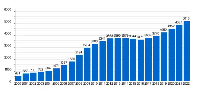 | Gráfica de evolución demográfica de Pioz[9] entre 2000 y 2022 |
