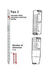 Pipetas graduadas de vidrio sin tiempo de espera, tipo 2 (Clases A y B). Pipetas para las cuales la capacidad correspondiente a cualquier línea de graduación se define como el volumen de agua, a 20 °C, expresado en mililitros, vertido por la pipeta, a 20 ℃, cuando esta se vacía desde la línea de graduación hasta la punta de vertido, fluyendo el líquido libremente hasta asegurarse que el menisco está en reposo en la punta de vertido, antes de retirar la pipeta del recipiente receptor.