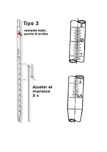Pipetas graduadas de vidrio sin tiempo de espera, tipo 3 (Clase B). Pipetas para las cuales la capacidad correspondiente a cualquier línea de graduación se define como el volumen de agua, a 20 °C, expresado en mililitros, vertido por la pipeta, a 20 °C, cuando esta se vacía desde la línea cero hasta dicha línea de graduación (o, en el caso del vertido de la capacidad total, hasta la punta de vertido), fluyendo el líquido libremente justo hasta que el enrase del menisco se sitúe sobre la línea de graduación, y sin permitir el drenaje del líquido adherido a las paredes antes del enrase final.