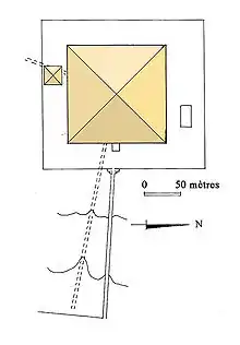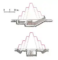 La pirámide medía 147 metros de lado y 93,50 metros de altura, aunque en su estado actual, mide 65 metros de altura. La entrada está en la cara norte, a 20 metros sobre el actual nivel del suelo.