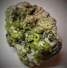 | Hábito cristalino | Cristales > 3mm, prismas cortos, hexagonal, botrioidal, globular, granular, fibroso | |