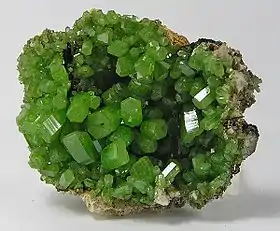 La piromorfita es un mineral de la clase 8 de los minerales fosfatos según la clasificación de Strunz, y dentro de esta pertenece al llamado «grupo del apatito». Fue descubierta en 1813 en Zschopau en los Montes Metálicos, en el estado de Sajonia (Alemania), siendo nombrada así por el mineralogista J.F.L. Hausmann del griego piros -fuego- y morfos -forma-, en alusión a la forma que adopta al recristalizar el mineral fundido.[1] Sinónimos poco usados son: pseudocampilita, piromorphita, sexangulita, poliesferita y plomo verde.