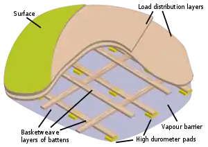 - Esta obra contiene una traducción total derivada de «Sprung floor» de Wikipedia en inglés, publicada por sus editores bajo la Licencia de documentación libre de GNU y la Licencia Creative Commons Atribución-CompartirIgual 4.0 Internacional.