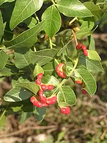 Es un árbol del género pistacia que está representado por especies tan conocidas como el pistacho, el lentisco o la cornicabra que abarca desde especies arbustivas hasta árboles adaptados a la sequía y el clima mediterráneo. LLamado en árabe betoum. En Irán se llama baneh.[3] En Canarias se lo conoce como almácigo.