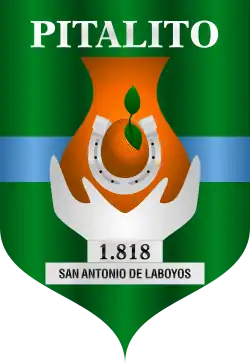 - Historia: Representado en la base del torno, donde se encuentra San Antonio y la fecha de fundación, simboliza el nacimiento de Pitalito. Los anteriores símbolos están sostenidos por una silueta blanca de dos manos que representa la amistad y laboriosidad de todos los Laboyanos.[12]