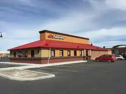 Restaurante con el techo distintivo y blanca de la muestra más antigua usada antes de 1999, típico de los restaurantes Pizza Hut.