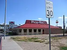Pizza Hut con el techo distintivo y con el logotipo usado desde el 2000 hasta 2012.