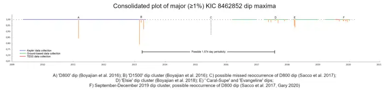 - Boyajian, Tabetha S.; Alonso, Roi; Ammerman, Alex; Armstrong, David; Ramos, A. Asensio; Barkaoui, K.; Beatty, Thomas G.; Benkhaldoun, Z. et al. (19 de enero de 2018). «The First Post-Kepler Brightness Dips of KIC 8462852». The Astrophysical Journal 853 (1): L8. Bibcode:2018ApJ...853L...8B. ISSN 2041-8213. S2CID 215751718. arXiv:1801.00732. doi:10.3847/2041-8213/aaa405.