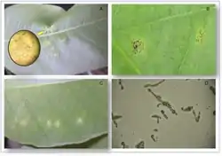 ![]() Signos y síntomas causados por Microcyclus ulei en hojas de Hevea brasiliensis. (A) Deformación de la hoja y esporulación de aislado GCL012 7 días después de la inoculación en RRIM 600. (B) Hoja con formación de estructuras estromáticas del aislado GCL012 con 24 dpi en RRIM 600. (C) Hoja con clon de FX 3864 mostrando la formación de zonas cloróticas 10 días después de la inoculación. (D) Germinación de conidia del aislado GCL012. Se observa el tubo de germen (450X) | ||