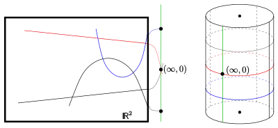 Partiendo nuevamente de y tomando como bloques las curvas con ecuaciones (parábolas y rectas), es efectiva la siguiente homogeneización: se añade a la curva el nuevo punto . Por lo tanto, el conjunto de puntos es . Esta geometría de parábolas se llama plano de Laguerre clásico (originalmente fue diseñado como la geometría de líneas rectas y de circunferencias orientadas, si bien ambas geometrías son isomorfas).