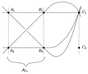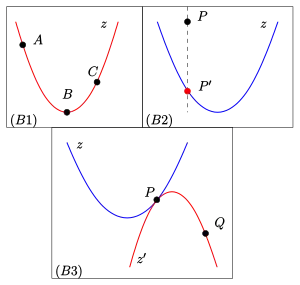 - Para cualquier ciclo , cualquier punto y cualquier punto que no sea paralelo a hay exactamente un ciclo a con , es decir, y se tocan entre sí en .