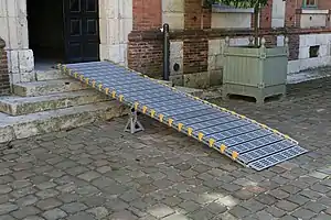 Los planos inclinados se utilizan mucho en forma de "rampas" para cargar y descargar mercancías en camiones, barcos y aviones.[4] Las rampas para sillas de ruedas se utilizan para permitir que las personas con movilidad reducida superen obstáculos verticales sin exceder su fuerza. Las escalera mecánicas y las cintas transportadoras inclinadas también son formas de plano inclinado.[7] En un funicular o ferrocarril por cable, un vagón de ferrocarril se sube por un plano inclinado con cables. Los planos inclinados también permiten que tanto personas como objetos pesados y frágiles salven de forma segura un desnivel vertical utilizando la fuerza normal del plano para distribuir el efecto de la gravedad. Las rampas de evacuación de las aeronaves permiten que las personas alcancen el suelo de forma rápida y segura desde la altura del compartimento de pasajeros de un avión comercial.