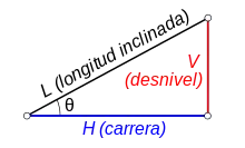 La ventaja mecánica de una rampa inclinada también se puede calcular a partir de la relación entre la longitud de la rampa L y su altura vertical V, porque el seno del ángulo de la rampa está dado por