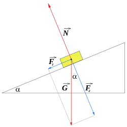 - Existe finalmente una fuerza de rozamiento, también conocida como fuerza de fricción (FR), que siempre se opone al sentido del movimiento del cuerpo respecto a la superficie,[13] y cuya magnitud depende tanto del peso como de las características superficiales del plano inclinado y la superficie en contacto del cuerpo que proporcionan un coeficiente de rozamiento. Esta fuerza debe tener un valor igual a F1=M.g.sen α, para que el cuerpo se mantenga en equilibrio. En el caso en que F1 fuese mayor que la fuerza de rozamiento el cuerpo se deslizaría hacia abajo por el plano inclinado. Por tanto para subir el cuerpo se debe realizar una fuerza con una magnitud que iguale o supere la suma de F1 + FR.