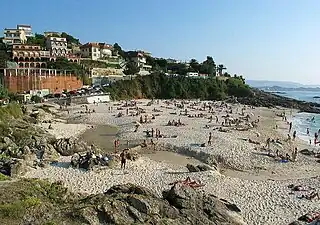 Playa mixta en donde se practica el nudismo,[6][7] de 100 metros de longitud y una anchura media de 50 metros con blancas y finas arenas, muy frecuentada por los vecinos más jóvenes de las proximidades.[8] En su margen derecha desemboca un pequeño arroyo y desde la playa se contemplan las próximas Islas Cíes. Su entorno se encuentra ocupado por chalets y un paseo litoral.[9]