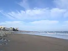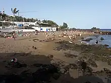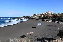 Playa artificial de 1200 m, de arena oscura y variedad de servicios.