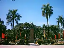 De las cuatro aristas se forman veredas diagonales que se unen en una explanada central adornada con ocho fuentes y en cuyo centro se erige una estatua ecuestre del General José de San Martín, prócer de la independencia argentina. Algunas obras de arte presentes entre los espacios verdes son las siguientes: una estatua de Eva Perón, completamente realizada en bronce sobre un pedestal; una cruz en memoria a los fallecidos en la masacre de Margarita Belén; diversos murales; y un monumento a Roma, con una estatua de Rómulo y Remo siendo amamantados por la loba en lo alto de dos columnas (obsequiado a la ciudad de Resistencia por parte de la Comunidad Italiana).