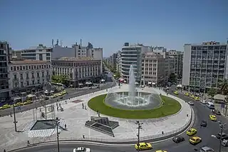 Dos de sus edificios más importantes son los antiguos hoteles neoclásicos de la zona: el Bagkeion y el Megas Alexandros, situados a ambos lados de la calle Athinas.[3] La escultura Pentakiklon ("cinco anillos") tiene su propia historia: colocada en la plaza en 2001, no funcionó hasta la Navidad de 2008, cuando cayó por primera vez agua en la escultura, haciendo que se muevan los círculos.[1]