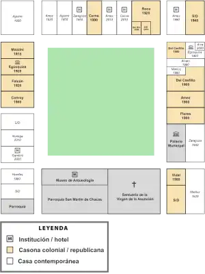 Resaltan los balcones de estilo barroco y republicano de las viviendas ubicadas en el perímetro, las fachadas blancas y las calles principales empedradas. En cada una de sus esquinas se encuentran esculturas pétreas de escenas costumbristas que representan a personajes típicos de la realidad chacasina.[1]