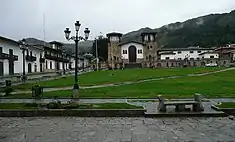 Panorámica de la plaza mayor de Chacas, destaca el amplio espacio central de césped.