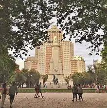 La plaza de España es un amplio espacio ajardinado de la ciudad de Madrid situado en el barrio de Argüelles, en el extremo sureste del distrito Moncloa-Aravaca. En su centro se encuentra una fuente monumental dedicada a Miguel de Cervantes. Hace de eje continuador uniendo la Gran Vía con la calle de la Princesa. Hasta poco antes de la construcción de la Gran Vía esta plaza se denominaba «plaza de San Marcial». Entre los edificios circundantes destacan, por su altura, la Torre de Madrid y el edificio España, además de un exponente del modernismo madrileño como la Casa Gallardo y el edificio de la Compañía Asturiana de Minas, actual sede de la Consejería de Cultura.