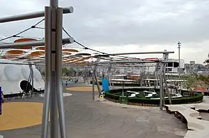 - Inspiraciones acuáticas. La plaza contiene un auditorio para 3.000 personas en el que se representa el espectáculo Hombre Vertiente diseñado por la productora argentina Ojalá. El espectáculo se representa seis veces al día y aborda el tema del agua descontrolada.[2]