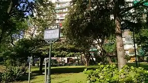 Vista de la Plazoleta Crisólogo Larralde desde la esquina de Rojas y Yerbal. De fondo se observa la línea de edificación de Honorio Pueyrredón.