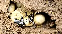 Las hembras depositan los huevos entre mediados de mayo y julio al menos después de un mes de la fecundación.[8] Las hembras depositan de 15 a 18 huevos en pequeñas cavidades despejadas, generalmente debajo de troncos podridos, tocones, tablas de madera, cortezas sueltas, rocas y madrigueras de roedores abandonadas.[18] Se sabe que la humedad del suelo también es un factor en la selección del nido del animal. Las hembras a menudo colocan nidos en regiones donde la humedad del suelo es más alta que en otras áreas. La posición vertical del nido también varía con la humedad, con nidos ubicados en cavidades más profundas que en sitios más secos.[19]