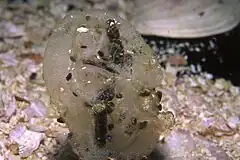 Tras la fertilización, los huevos eclosionan larvas planctónicas, que cuentan con una concha para protegerse durante la fase larval, y que, al evolucionar a su forma definitiva la pierden.[8] La larva deambula por la columna de agua hasta que encuentra una fuente de comida, entonces se adhiere y metamorfosea al animal adulto.