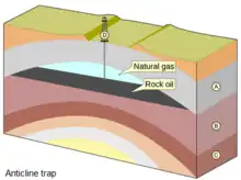 Las trampas anticlinales se forman por plegamiento de la roca. Por ejemplo, si una unidad de arenisca porosa cubierta de esquisto de baja permeabilidad se pliega en un anticlinal, puede contener hidrocarburos atrapados en la cresta del pliegue. La mayoría de las trampas anticlinales se crean como resultado de la presión lateral que pliega las capas de roca, pero también pueden producirse por la compactación de los sedimentos.[20]