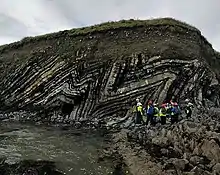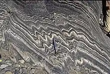 Plegamiento o pliegue es la curvatura producida en rocas por esfuerzos tectónicos o gravitatorios.[1][2] La curvatura suele manifestarse en los elementos planares o con superficies de discontinuidad de las rocas, como estratificación, foliación o agregados minerales lineares. Muchas de estas superficies han sido aproximadamente planas antes del plegamiento.[3] La forma de los plegamientos puede variar considerablemente.[3] Los plegamientos son el resultado de deformación dúctil, es decir, sin rotura.[3] Algunos plegamientos como los plegamientos de arrastre están asociados a fallas.[4]